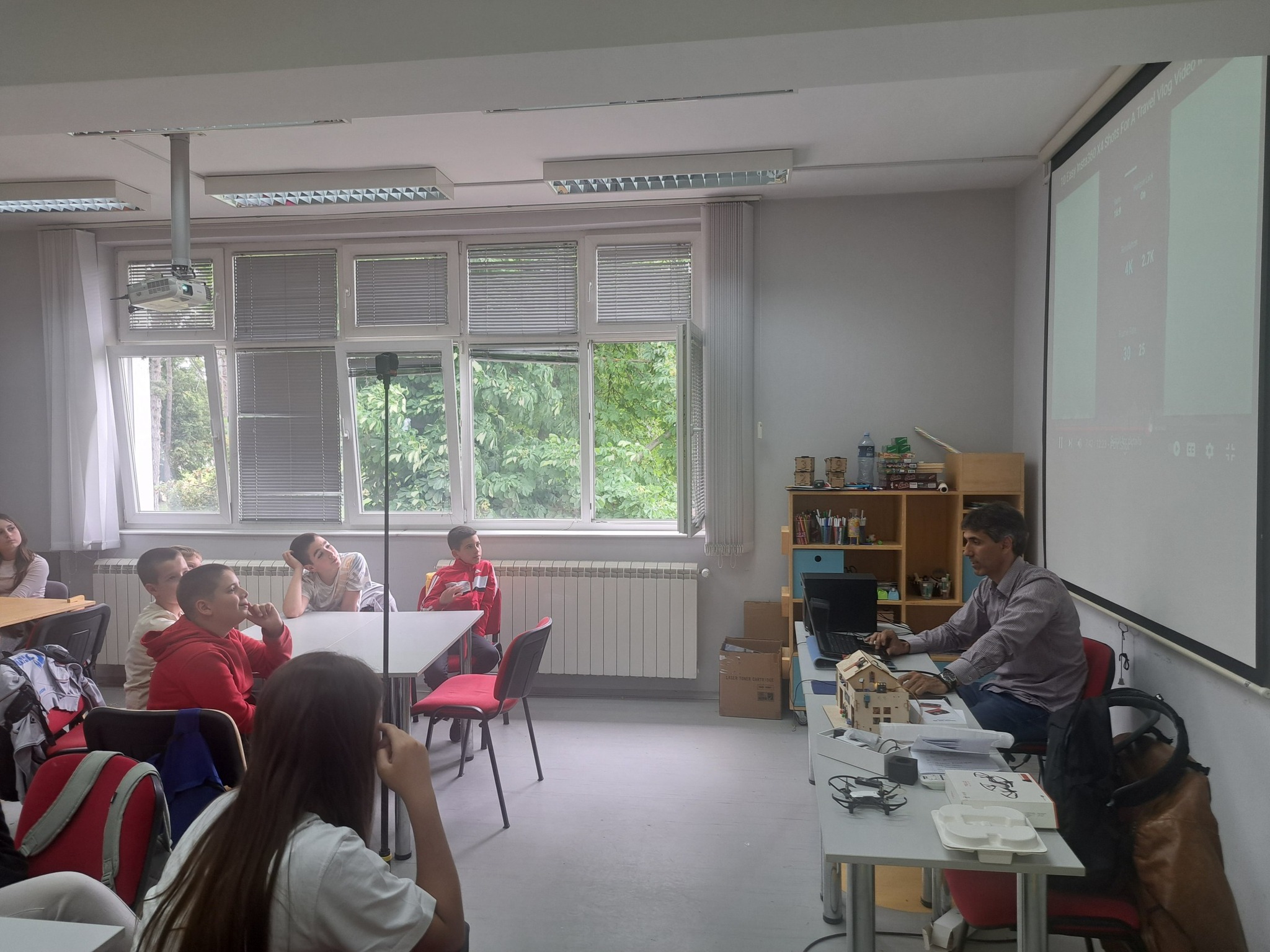 Za početak se diskutovalo sa učenicima o njihovom iskustvu korišćenja raznih kamera. Objašnjenje koncepta 360°, snimanja i predstavljanje funkcija i mogućnosti Insta 360° kamere. Vežbe za pravilno poziciranje kamere, saveti za snimanje urbanih okruženja u 360° formatu.